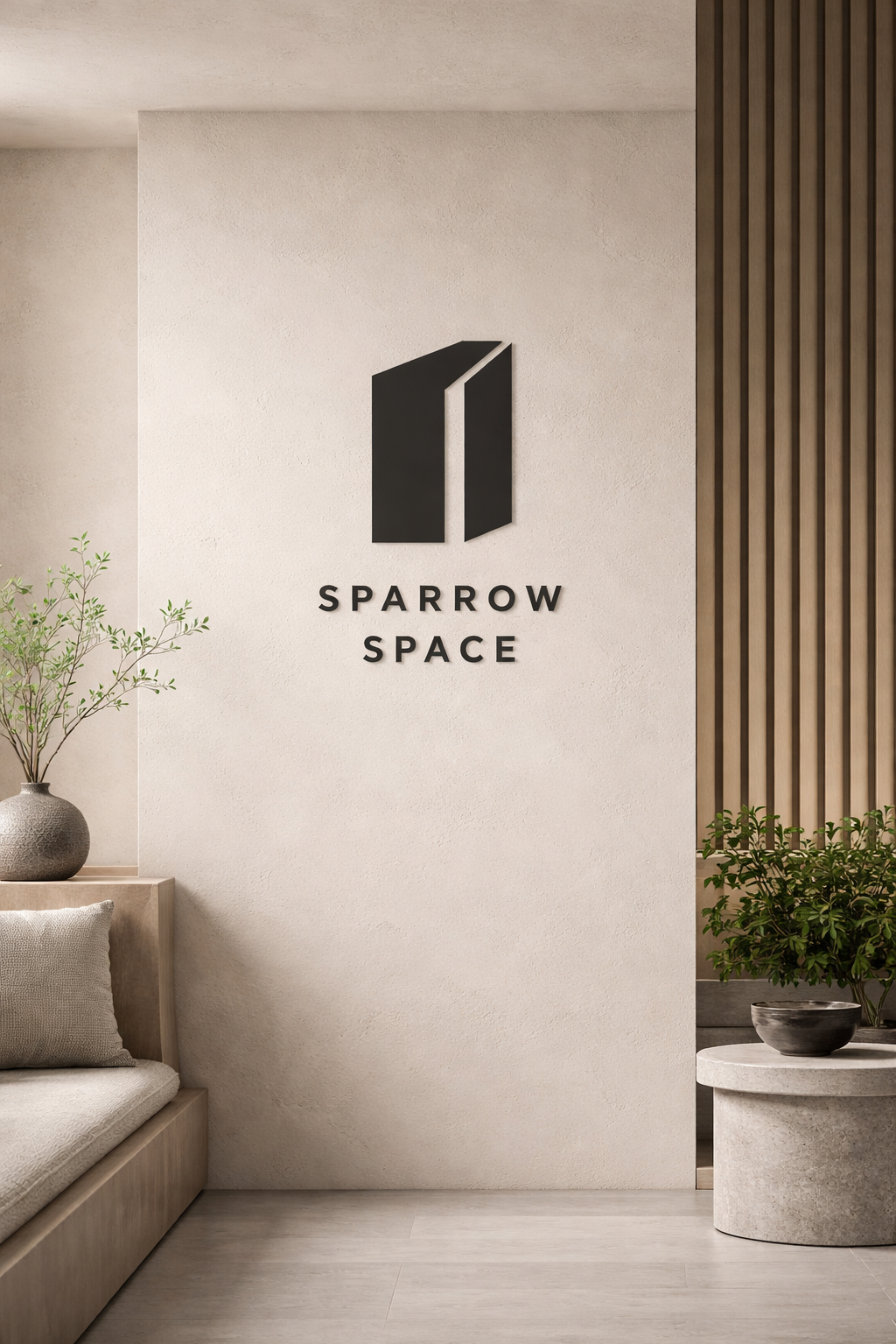 ロゴは「わずかに開いた空間」を表現しています。抑制された幾何構成と余白のバランスにより、室内設計の秩序と静けさを体現しています。装飾に頼らず、構造そのもので専門性と持続的価値を示します。