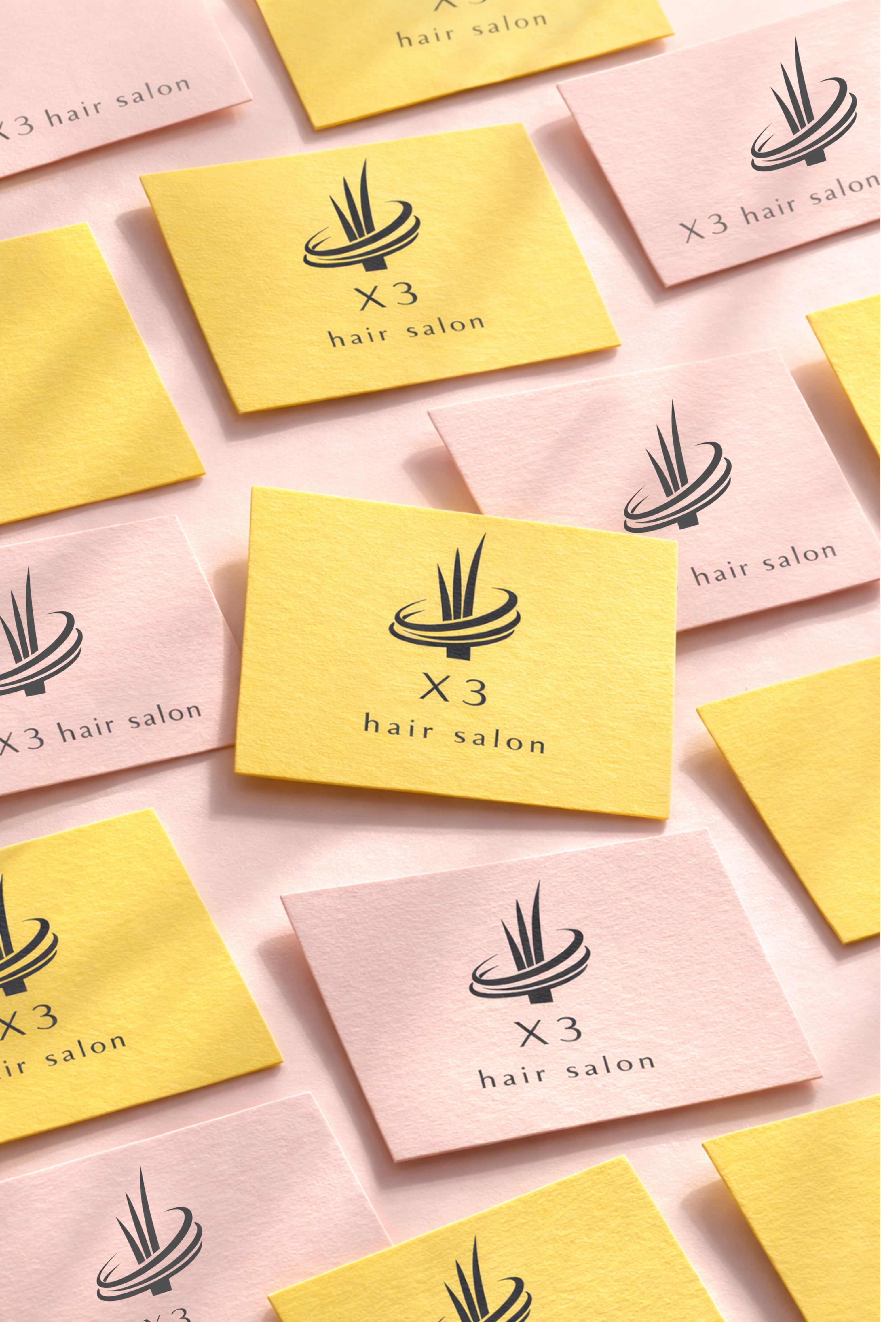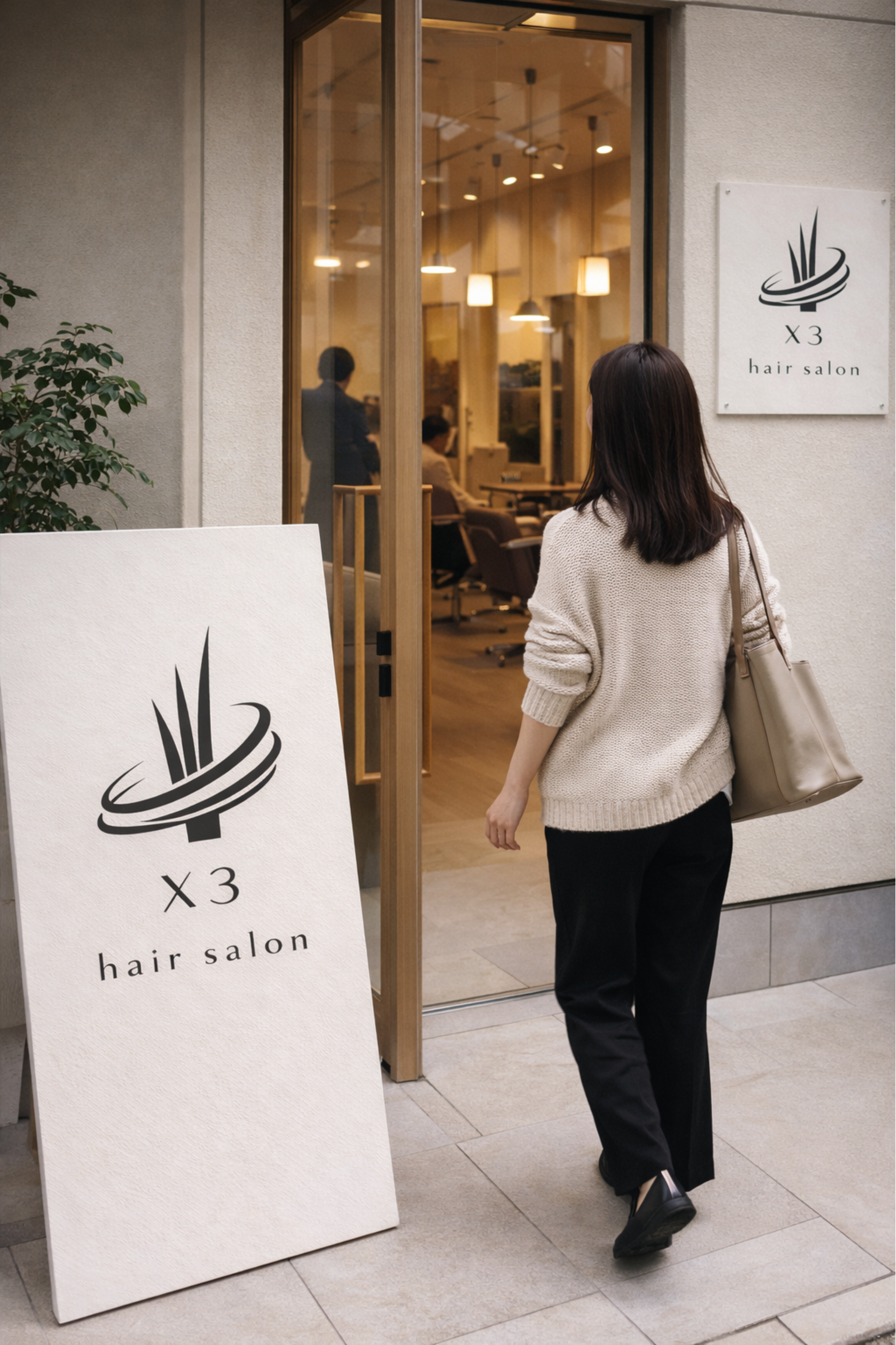 ロゴは「上へ伸びる髪の動き」をコンセプトとしています。三本のラインはレイヤーと成長を象徴し、円環のフォルムはパーマのリズムと流動性を表現しています。余白と抑制された構成により、静かで上質な日本的美意識を体現しています。